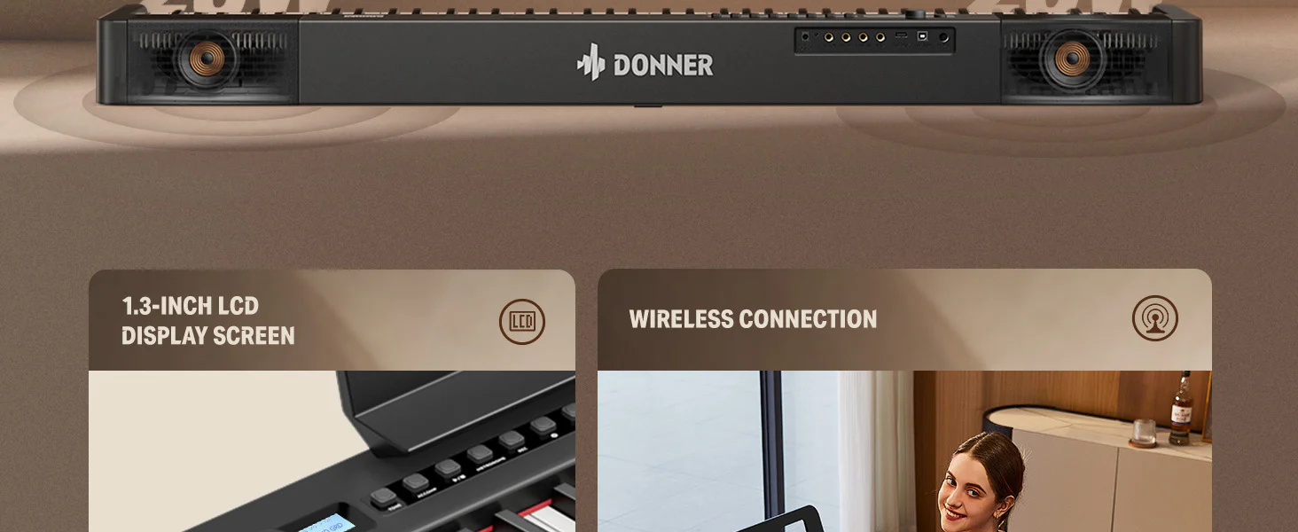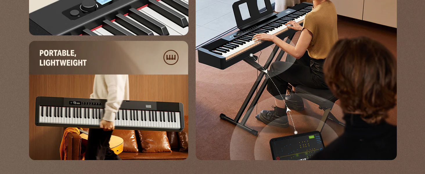 【Teclado de 88 teclas multiuso】Este piano Donner de 88 teclas con diseño aerodinámico es portátil y ligero, diseñado para ensayos, aprendizaje, creación, práctica o actuación.