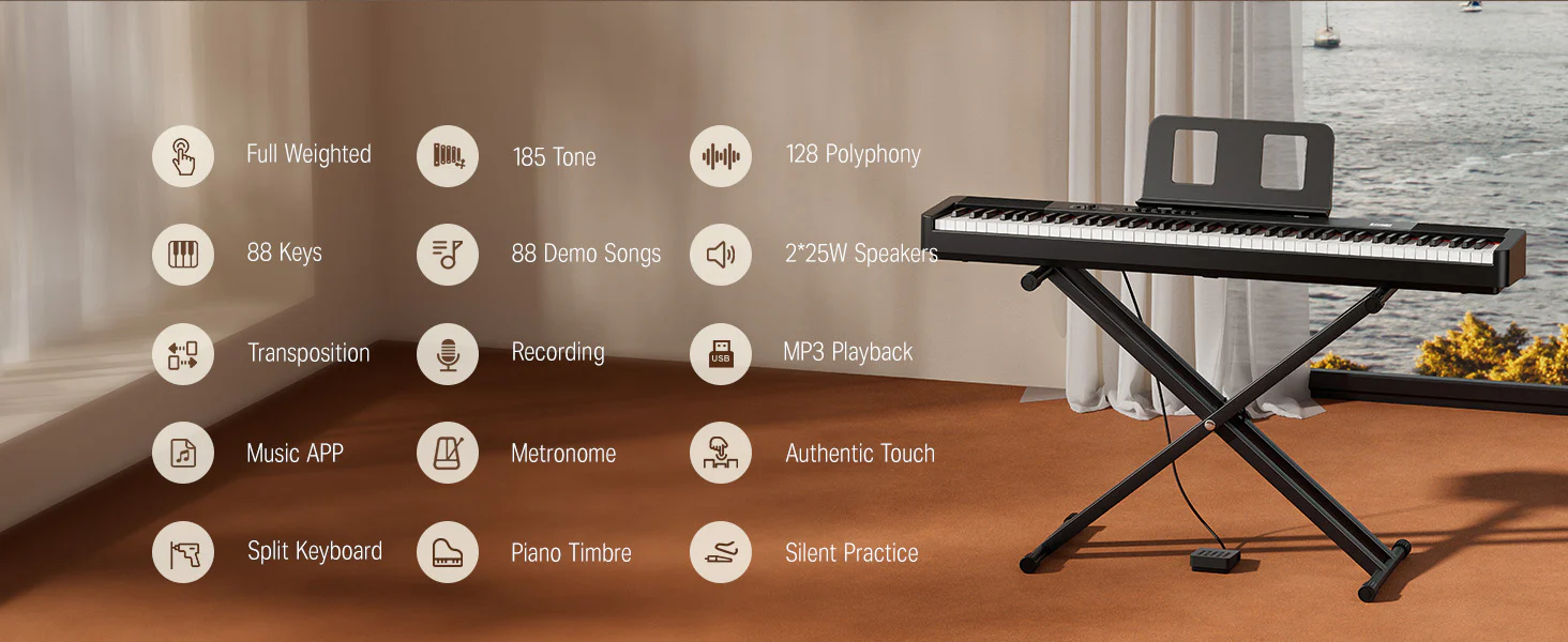 【185 tonos y 116 polifonías】 El piano de 88 teclas integra 185 tipos de tonos (como ukelele, tambores, bajo, etc.), presentando vividamente las voces de diferentes instrumentos y despertando tu interés por aprender música. Con una polifonía máxima de 116 notas, los músicos pueden distinguir claramente los tonos en los efectos de coro y reverberación en diversas ocasiones.
